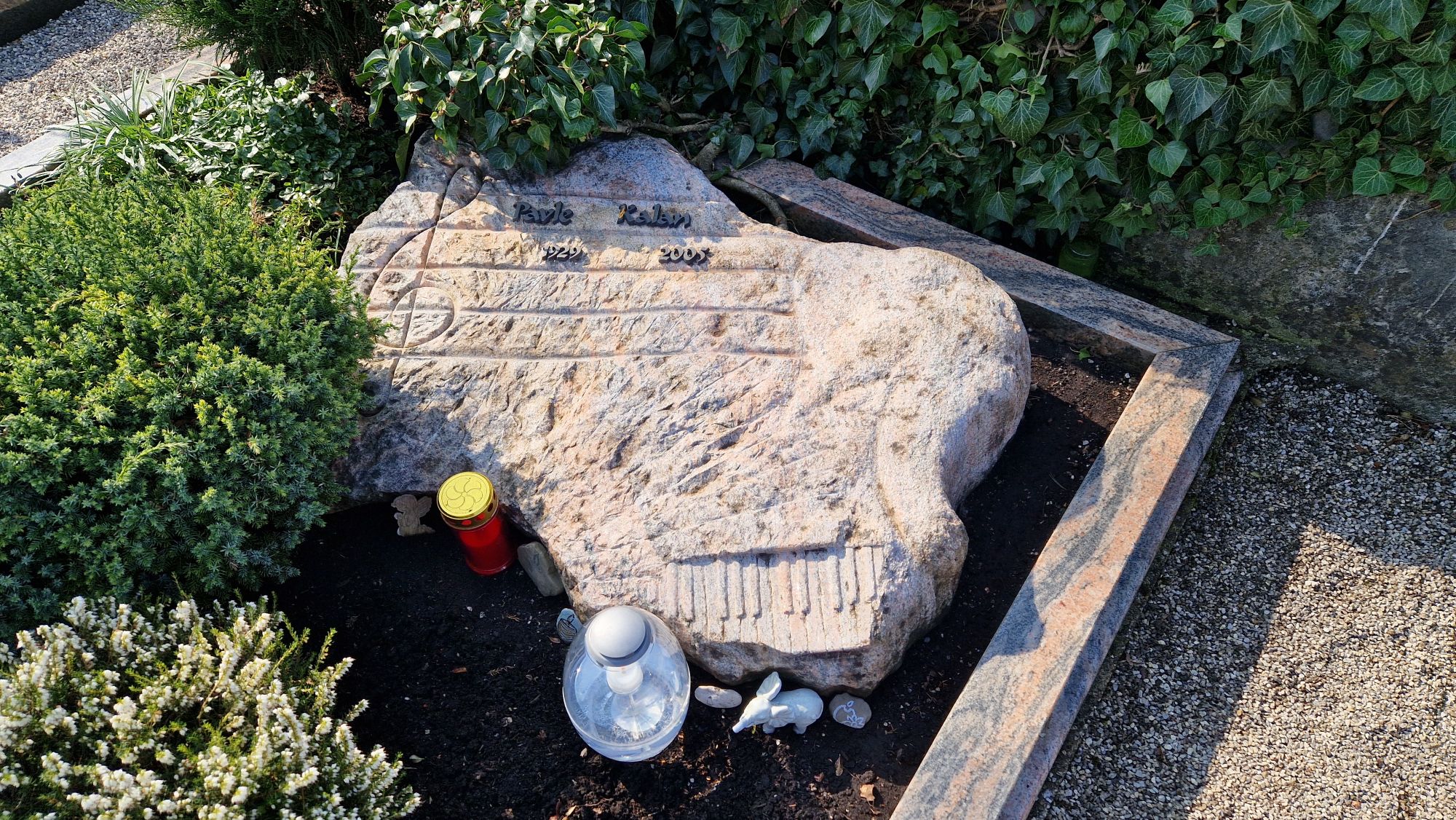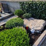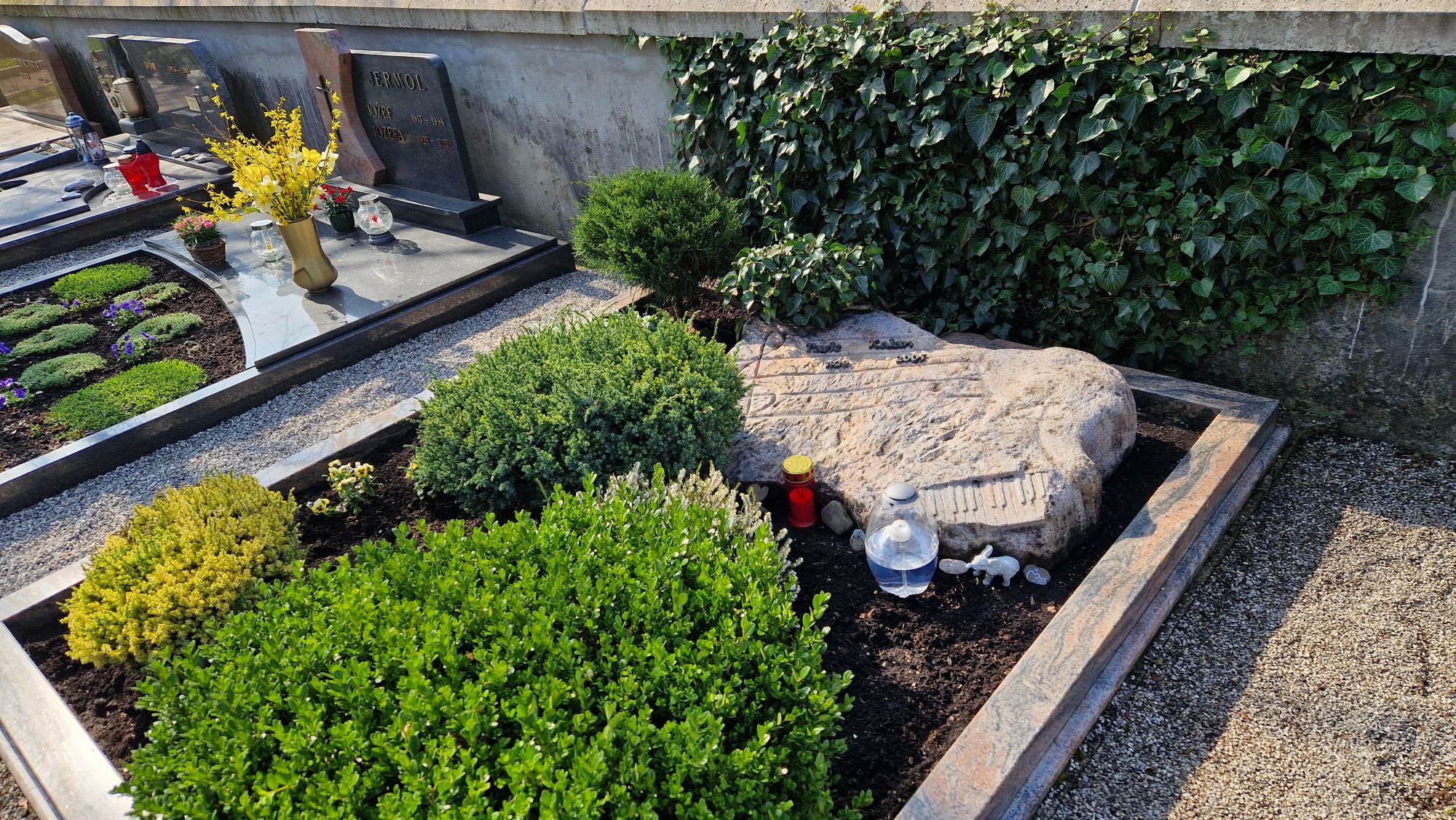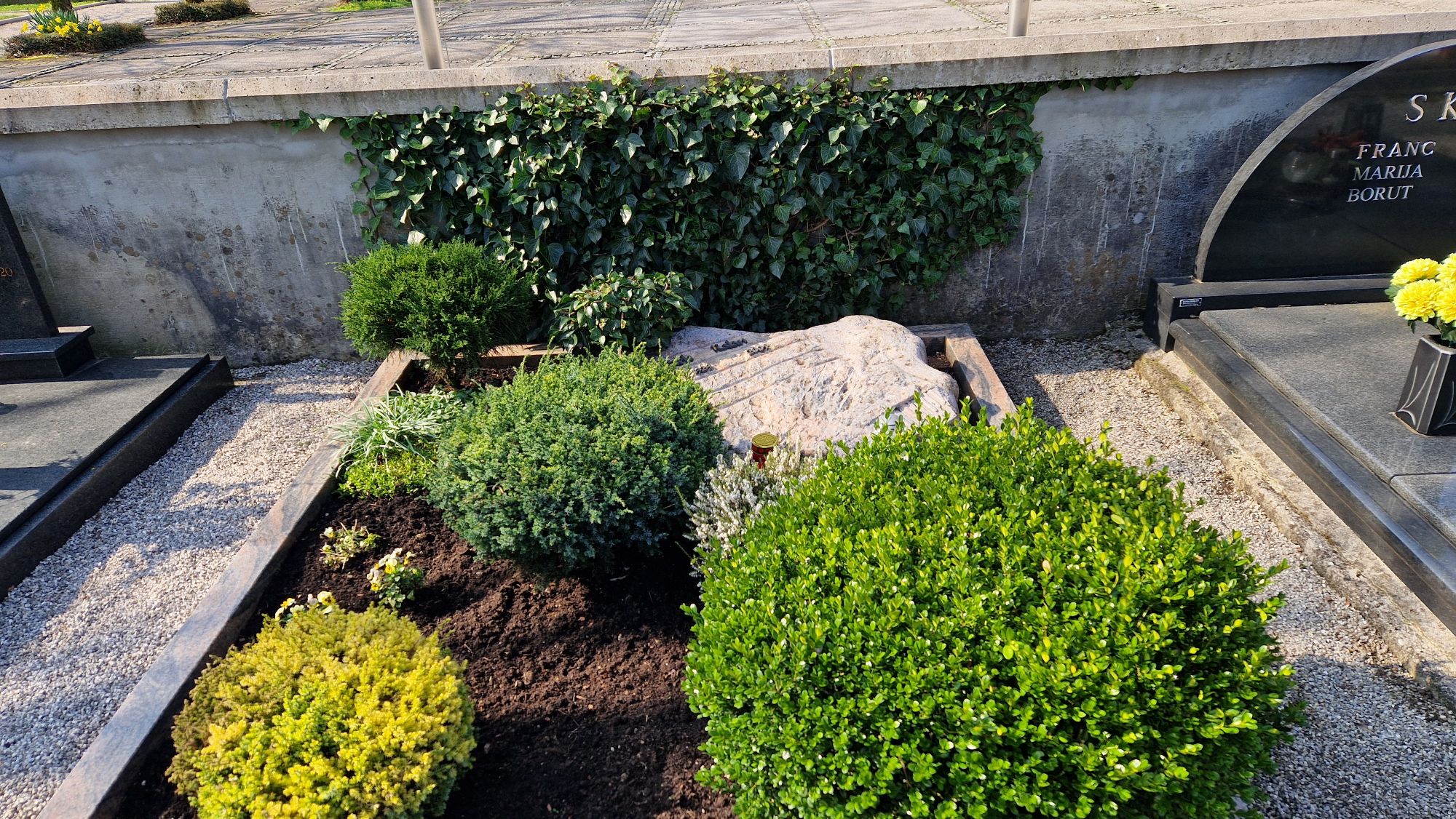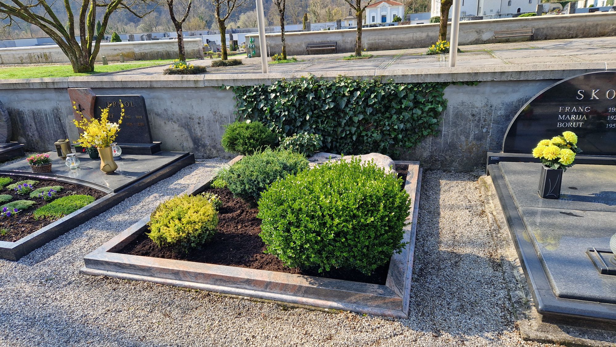 Po vhodu mimo vežice na novi del pokopališča. Takoj po vhodu na desni strani ob zidu 5. grob.